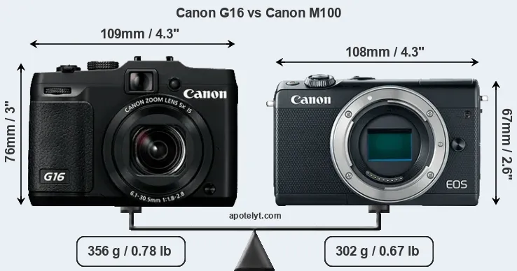 The Canon PowerShot G16 and the Canon EOS M100 are two digital cameras that were announced, respectively, in August 2013 and August 2017. The G16 is a fixed lens compact, while the M100 is a mirrorless interchangeable lens camera. The cameras are based on a 1/1.7-inch (G16) and an APS-C (M100) sensor. The G16 has a resolution of 12 megapixels, whereas the M100 provides 24 MP.
