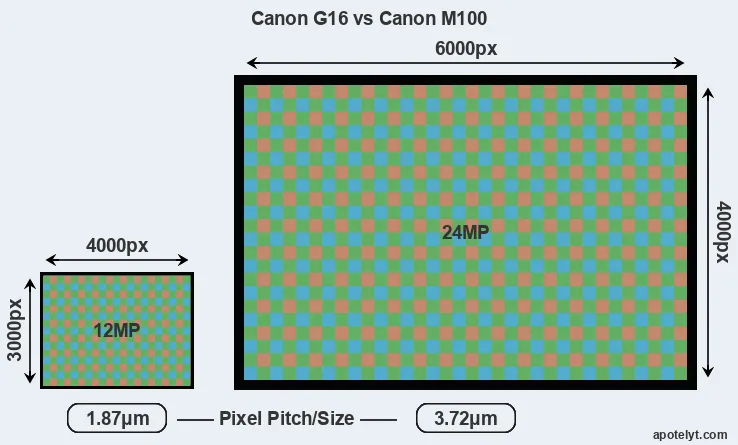 With 24MP, the M100 offers a higher resolution than the G16 (12MP), but the M100 nevertheless has larger individual pixels (pixel pitch of 3.72μm versus 1.87μm for the G16) due to its larger sensor. Moreover, the M100 is a much more recent model (by 4 years) than the G16, and its sensor will have benefitted from technological advances during this time that further enhance the light gathering capacity of its pixel-units.