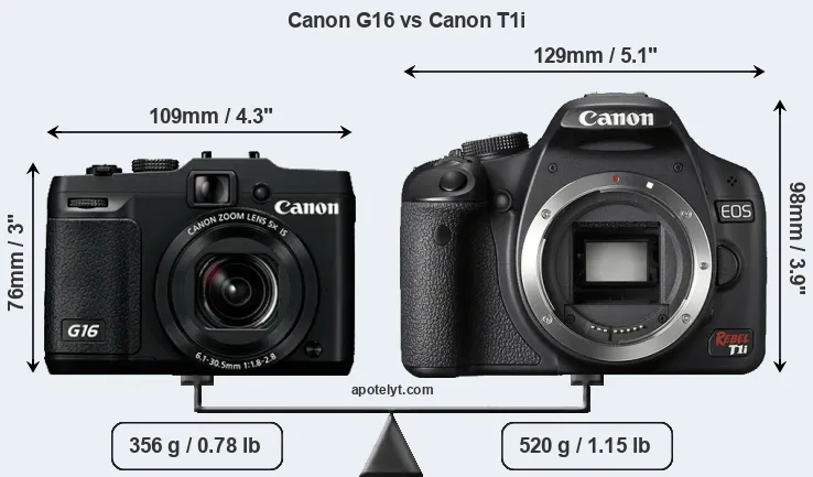 An illustration of the physical size and weight of the Canon G16 and the Canon T1i is provided in the side-by-side display below. The two cameras are presented according to their relative size. Three consecutive views from the front, the top, and the rear side are shown. All size dimensions are rounded to the nearest millimeter.