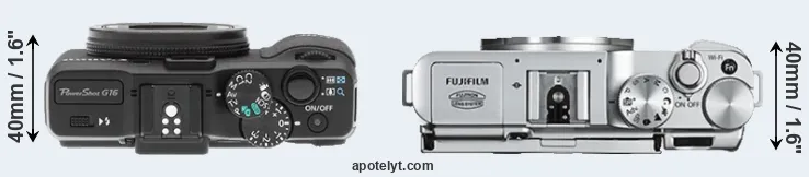 The physical size and weight of the Canon G16 and the Fujifilm X-A2 are illustrated in the side-by-side display below. The two cameras are presented according to their relative size. Three consecutive views from the front, the top, and the rear side are shown. All size dimensions are rounded to the nearest millimeter.