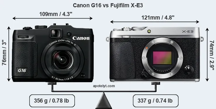 An illustration of the physical size and weight of the Canon G16 and the Fujifilm X-E3 is provided in the side-by-side display below. The two cameras are presented according to their relative size. Three successive views from the front, the top, and the rear are shown. All size dimensions are rounded to the nearest millimeter.