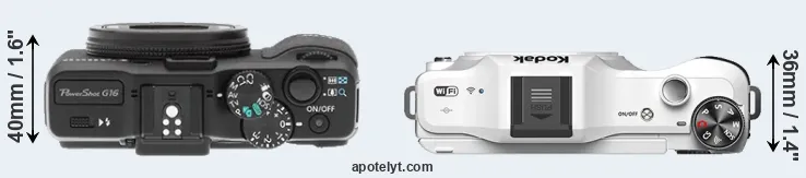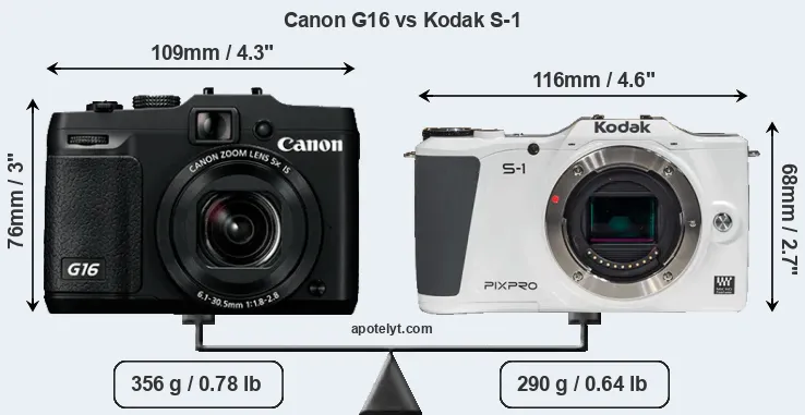 The physical size and weight of the Canon G16 and the Kodak S-1 are illustrated in the side-by-side display below. The two cameras are presented according to their relative size. Three consecutive perspectives from the front, the top, and the back are available. All width, height and depth dimensions are rounded to the nearest millimeter.