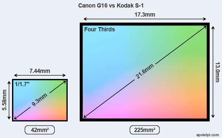 Of the two cameras under consideration, the Canon G16 features a 1/1.7-inch sensor and the Kodak S-1 a Four Thirds sensor. The sensor area in the S-1 is 436 percent bigger. As a result of these sensor size differences, the cameras have a format factor of, respectively, 4.65 and 2.0. Both cameras feature a native aspect ratio (sensor width to sensor height) of 4:3.