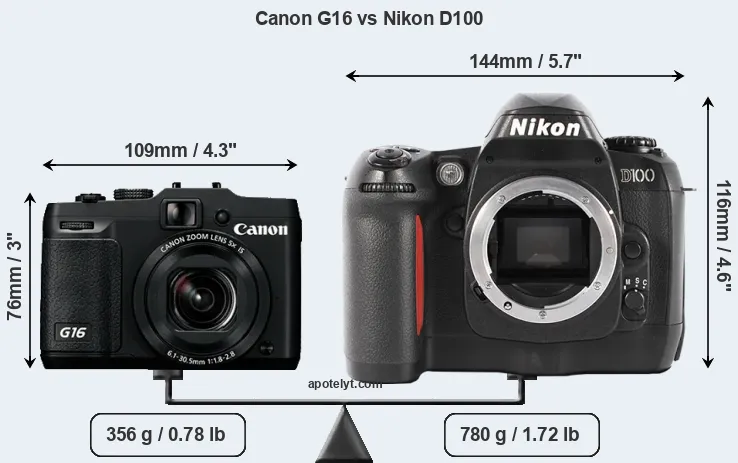 The side-by-side display below illustrates the physical size and weight of the Canon G16 and the Nikon D100. The two cameras are presented according to their relative size. Three successive views from the front, the top, and the rear are shown. All width, height and depth measures are rounded to the nearest millimeter.