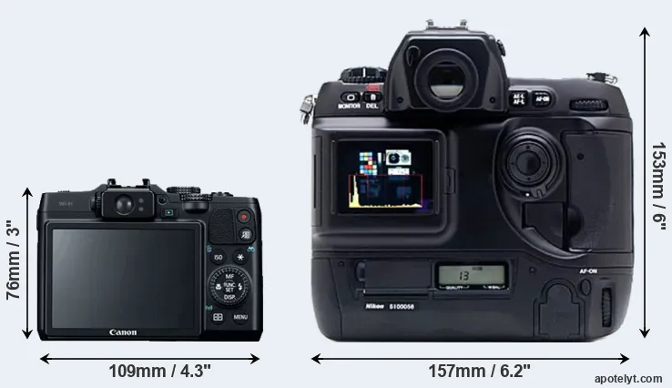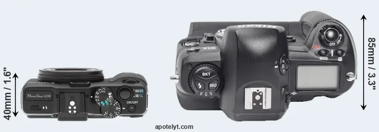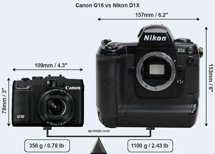 The side-by-side display below illustrates the physical size and weight of the Canon G16 and the Nikon D1X. The two cameras are presented according to their relative size. Three consecutive perspectives from the front, the top, and the back are available. All width, height and depth dimensions are rounded to the nearest millimeter.