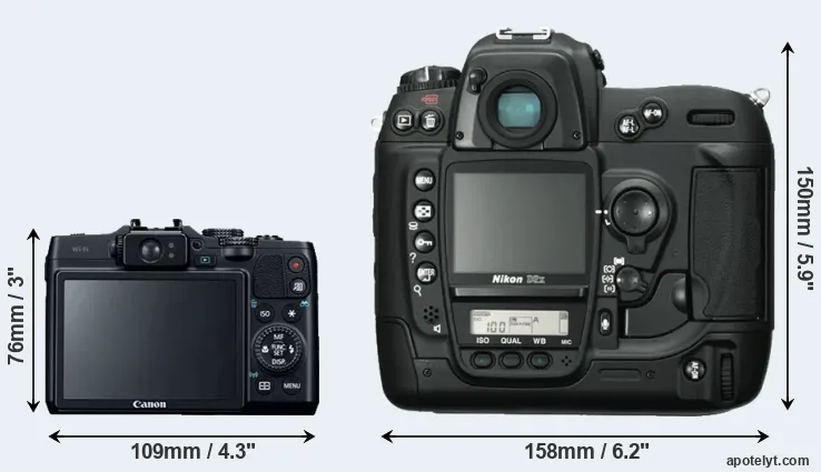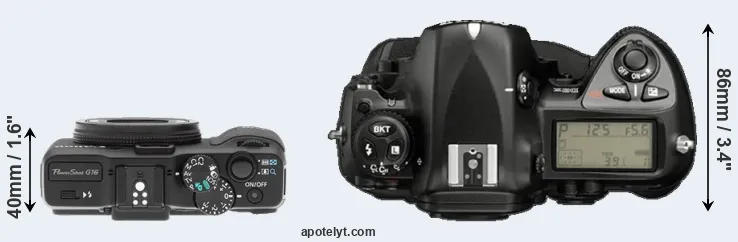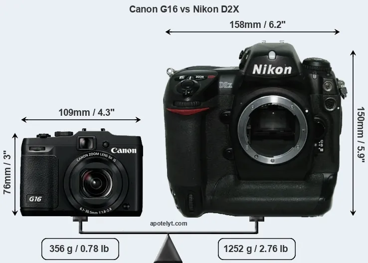 The side-by-side display below illustrates the physical size and weight of the Canon G16 and the Nikon D2X. The two cameras are presented according to their relative size. Three consecutive views from the front, the top, and the rear side are shown. All width, height and depth dimensions are rounded to the nearest millimeter.