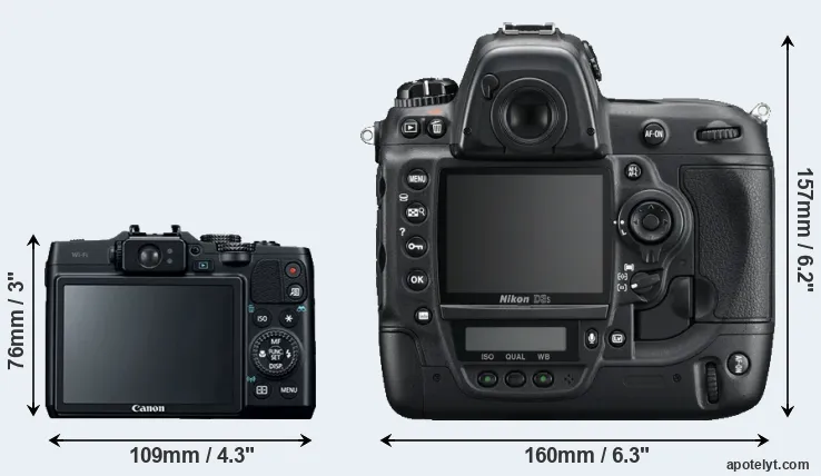 An illustration of the physical size and weight of the Canon G16 and the Nikon D3S is provided in the side-by-side display below. The two cameras are presented according to their relative size. Three successive views from the front, the top, and the rear are shown. All width, height and depth dimensions are rounded to the nearest millimeter.