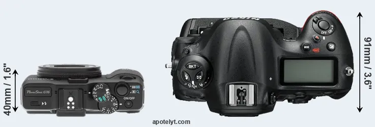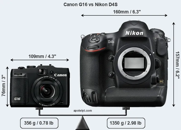 An illustration of the physical size and weight of the Canon G16 and the Nikon D4S is provided in the side-by-side display below. The two cameras are presented according to their relative size. Three successive views from the front, the top, and the rear are shown. All size dimensions are rounded to the nearest millimeter.