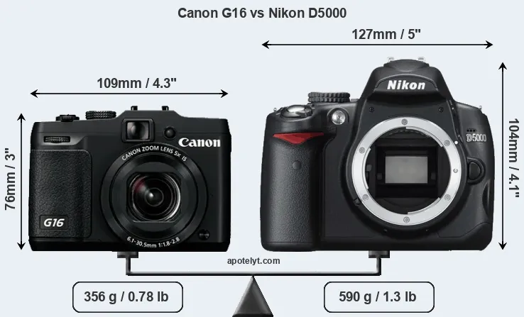 The side-by-side display below illustrates the physical size and weight of the Canon G16 and the Nikon D5000. The two cameras are presented according to their relative size. Three successive views from the front, the top, and the rear are shown. All width, height and depth measures are rounded to the nearest millimeter.