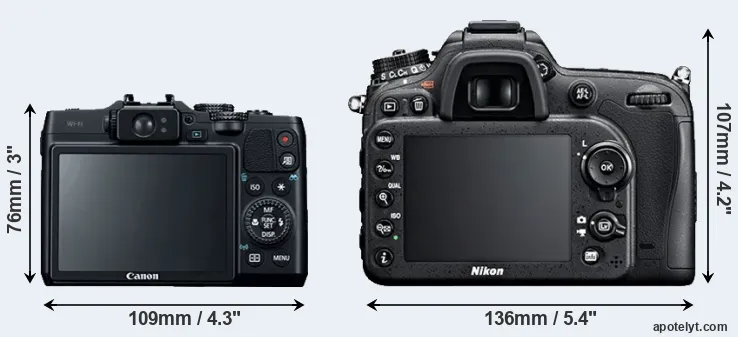 The physical size and weight of the Canon G16 and the Nikon D7100 are illustrated in the side-by-side display below. The two cameras are presented according to their relative size. Three consecutive perspectives from the front, the top, and the back are available. All width, height and depth dimensions are rounded to the nearest millimeter.