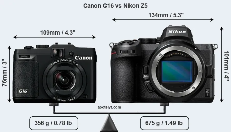 An illustration of the physical size and weight of the Canon G16 and the Nikon Z5 is provided in the side-by-side display below. The two cameras are presented according to their relative size. Three successive views from the front, the top, and the rear are shown. All width, height and depth measures are rounded to the nearest millimeter.