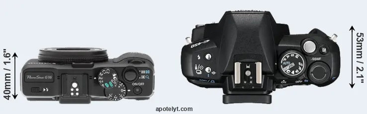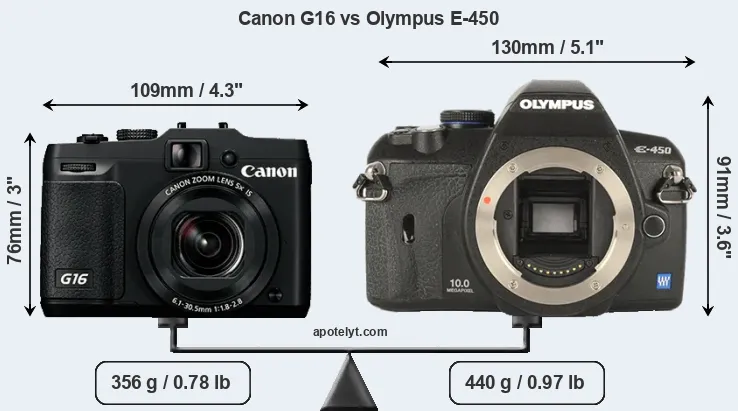 The side-by-side display below illustrates the physical size and weight of the Canon G16 and the Olympus E-450. The two cameras are presented according to their relative size. Three consecutive perspectives from the front, the top, and the back are available. All width, height and depth measures are rounded to the nearest millimeter.