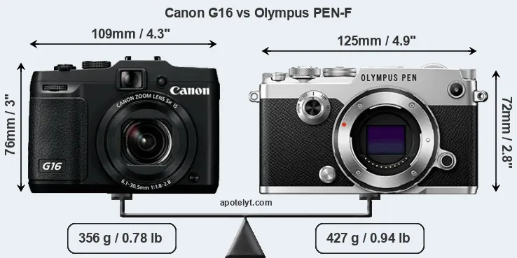 If the front view area (width x height) of the cameras is taken as an aggregate measure of their size, the Olympus PEN-F is notably larger (9 percent) than the Canon G16. In this context, it is worth noting that neither the G16 nor the PEN-F are weather-sealed.