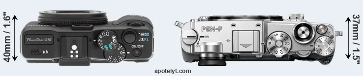 An illustration of the physical size and weight of the Canon G16 and the Olympus PEN-F is provided in the side-by-side display below. The two cameras are presented according to their relative size. Three consecutive perspectives from the front, the top, and the back are available. All width, height and depth measures are rounded to the nearest millimeter.