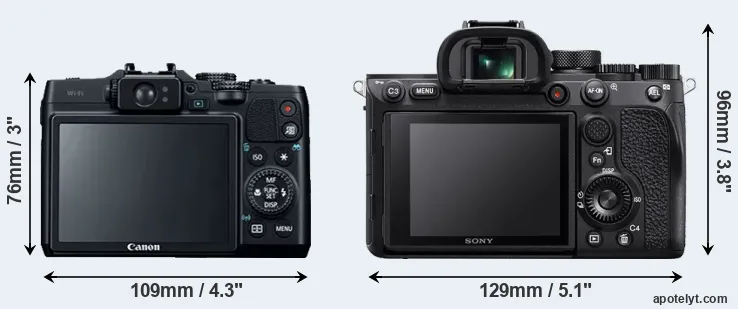 If the front view area (width x height) of the cameras is taken as an aggregate measure of their size, the Sony A7R IV is considerably larger (49 percent) than the Canon G16. It is noteworthy in this context that the A7R IV is splash and dust-proof, while the G16 does not feature any corresponding weather-sealing.