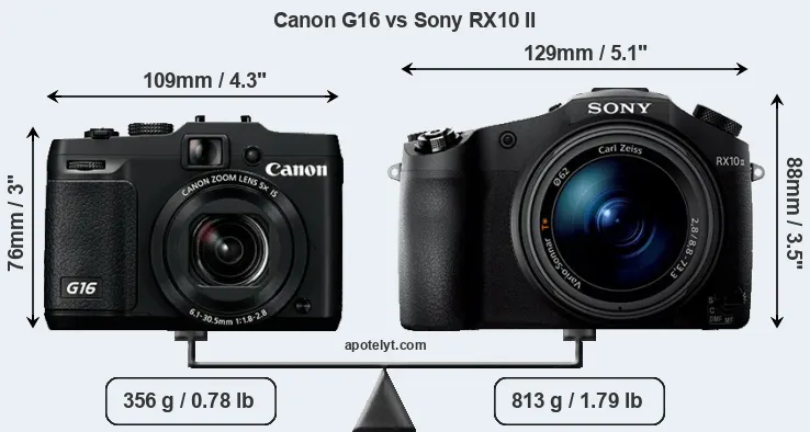If the front view area (width x height) of the cameras is taken as an aggregate measure of their size, the Sony RX10 II is notably larger (37 percent) than the Canon G16. Moreover, the RX10 II is substantially heavier (128 percent) than the G16. It is noteworthy in this context that the RX10 II is splash and dust-proof, while the G16 does not feature any corresponding weather-sealing.