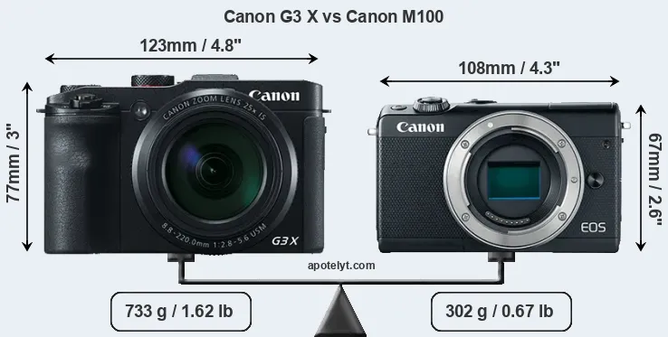 The side-by-side display below illustrates the physical size and weight of the Canon G3 X and the Canon M100. The two cameras are presented according to their relative size. Three consecutive perspectives from the front, the top, and the back are available. All width, height and depth dimensions are rounded to the nearest millimeter.