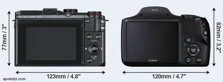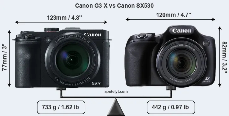 If the front view area (width x height) of the cameras is taken as an aggregate measure of their size, the Canon SX530 is somewhat larger (4 percent) than the Canon G3 X. However, the SX530 is substantially lighter (40 percent) than the G3X. It is worth mentioning in this context that the G3X is splash and dust resistant, while the SX530 does not feature any corresponding weather-sealing.