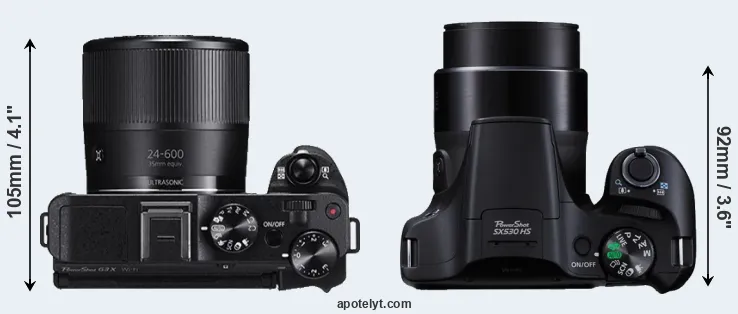 The physical size and weight of the Canon G3 X and the Canon SX530 are illustrated in the side-by-side display below. The two cameras are presented according to their relative size. Three consecutive perspectives from the front, the top, and the back are available. All width, height and depth measures are rounded to the nearest millimeter.