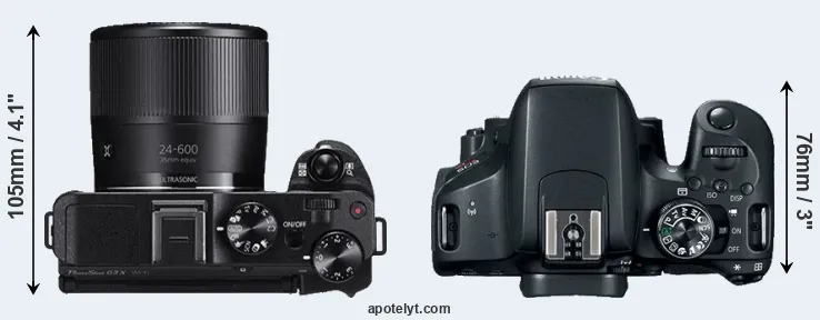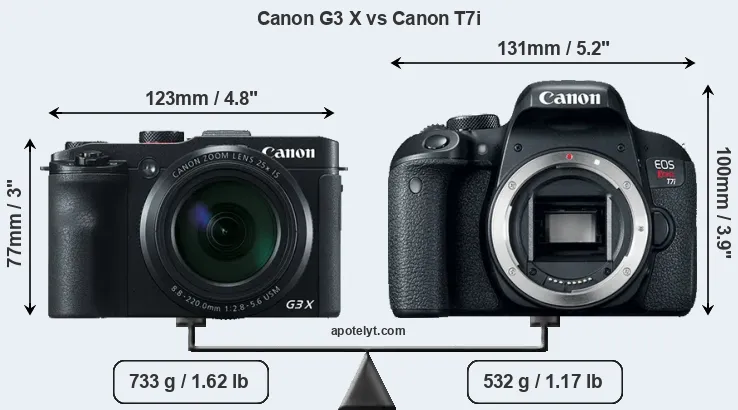 An illustration of the physical size and weight of the Canon G3 X and the Canon T7i is provided in the side-by-side display below. The two cameras are presented according to their relative size. Three consecutive views from the front, the top, and the rear side are shown. All width, height and depth measures are rounded to the nearest millimeter.