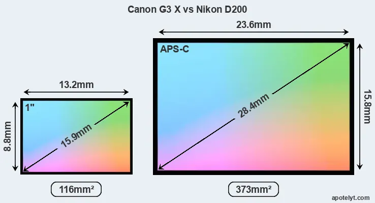 Of the two cameras under consideration, the Canon G3 X features an one-inch sensor and the Nikon D200 an APS-C sensor. The sensor area in the D200 is 222 percent bigger. As a result of these sensor size differences, the cameras have a format factor of, respectively, 2.7 and 1.5. Both cameras have a native aspect ratio (sensor width to sensor height) of 3:2.