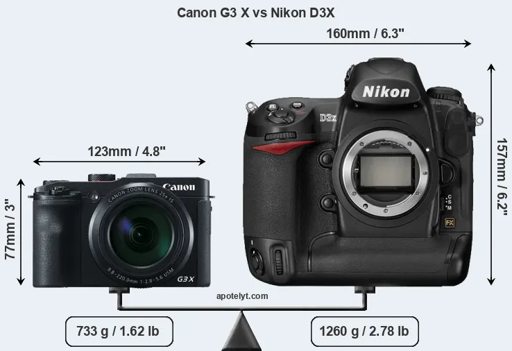 An illustration of the physical size and weight of the Canon G3 X and the Nikon D3X is provided in the side-by-side display below. The two cameras are presented according to their relative size. Three consecutive views from the front, the top, and the rear side are shown. All width, height and depth measures are rounded to the nearest millimeter.