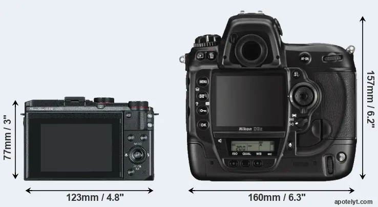 If the front view area (width x height) of the cameras is taken as an aggregate measure of their size, the Nikon D3X is considerably larger (165 percent) than the Canon G3 X. In this context, it is worth noting that both cameras are splash and dust-proof and can, hence, be used in inclement weather conditions or harsh environments.