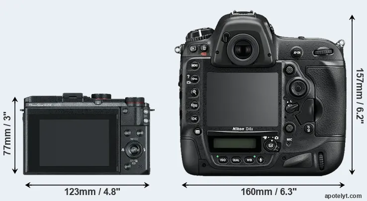 The above size and weight comparisons are to some extent incomplete and possibly misleading, as the G3X has a lens built in, whereas the D4S is an interchangeable lens camera that requires a separate lens. Attaching the latter will add extra weight and bulk to the setup. You can compare the optics available for the D4S and their specifications in the Nikon Lens Catalog.