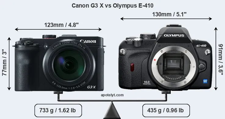 An illustration of the physical size and weight of the Canon G3 X and the Olympus E-410 is provided in the side-by-side display below. The two cameras are presented according to their relative size. Three successive views from the front, the top, and the rear are shown. All width, height and depth measures are rounded to the nearest millimeter.