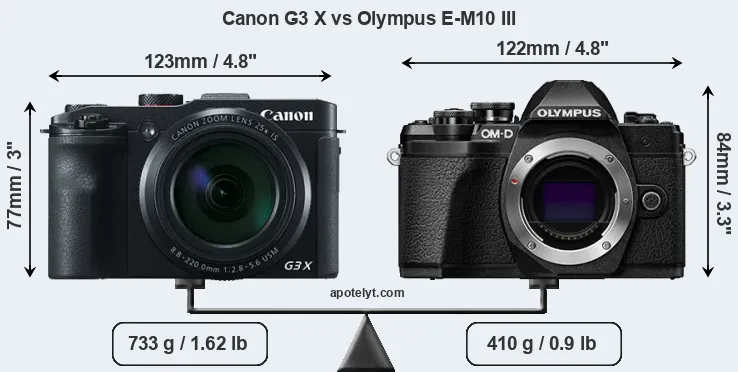 If the front view area (width x height) of the cameras is taken as an aggregate measure of their size, the Olympus E-M10 III is notably larger (8 percent) than the Canon G3 X. It is worth mentioning in this context that the G3X is splash and dust resistant, while the E-M10 III does not feature any corresponding weather-sealing.