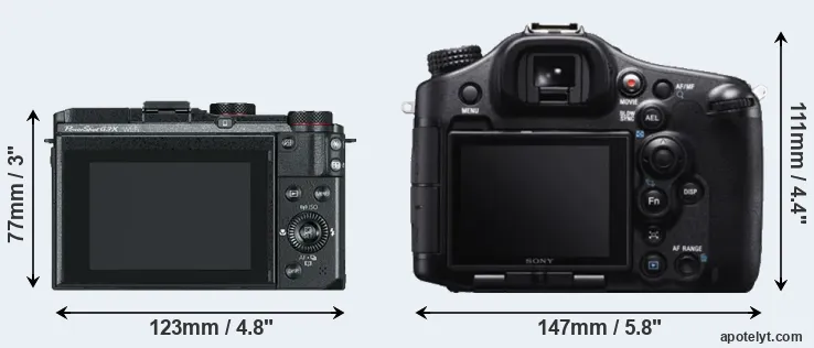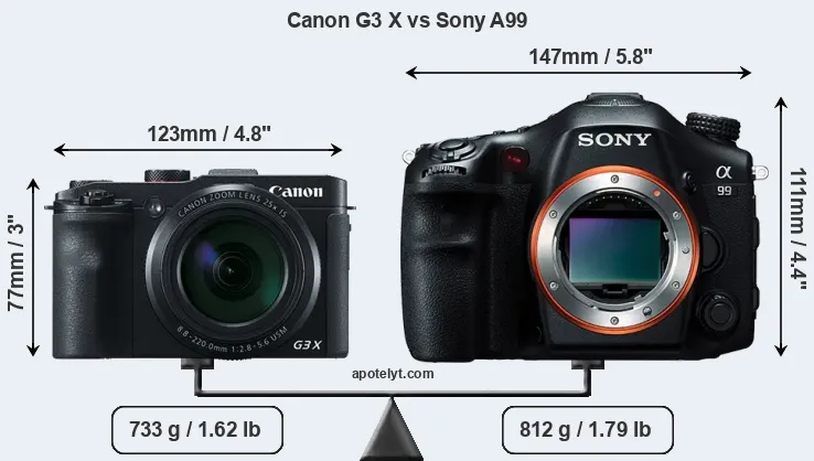 If the front view area (width x height) of the cameras is taken as an aggregate measure of their size, the Sony A99 is considerably larger (72 percent) than the Canon G3 X. In this context, it is worth noting that both cameras are splash and dust-proof and can, hence, be used in inclement weather conditions or harsh environments.