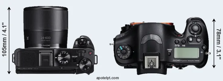 The above size and weight comparisons are to some extent incomplete and possibly misleading, as the G3X has a lens built in, whereas the A99 is an interchangeable lens camera that requires a separate lens. Attaching the latter will add extra weight and bulk to the setup.