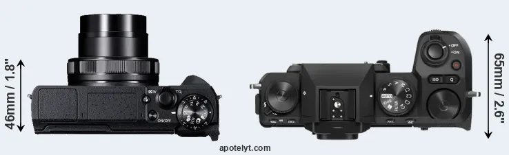 If the front view area (width x height) of the cameras is taken as an aggregate measure of their size, the Fujifilm X-S20 is considerably larger (61 percent) than the Canon G5 X Mark II. In this context, it is worth noting that neither the G5X Mark II nor the X-S20 are weather-sealed.