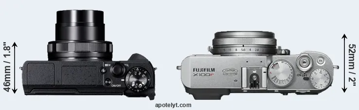The side-by-side display below illustrates the physical size and weight of the Canon G5 X Mark II and the Fujifilm X100F. The two cameras are presented according to their relative size. Three consecutive views from the front, the top, and the rear side are shown. All width, height and depth dimensions are rounded to the nearest millimeter.