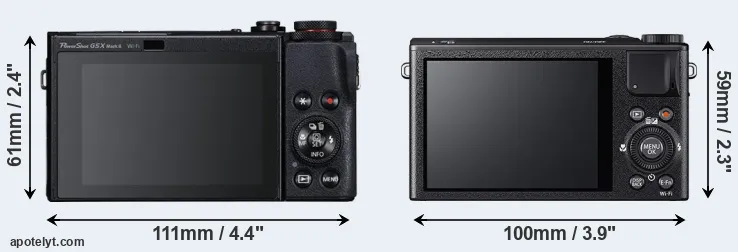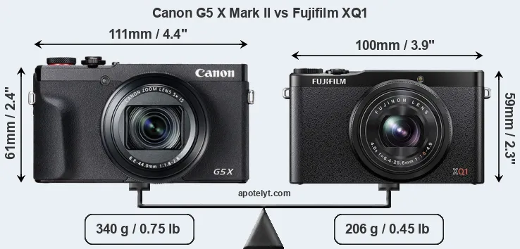 The side-by-side display below illustrates the physical size and weight of the Canon G5 X Mark II and the Fujifilm XQ1. The two cameras are presented according to their relative size. Three consecutive perspectives from the front, the top, and the back are available. All size dimensions are rounded to the nearest millimeter.