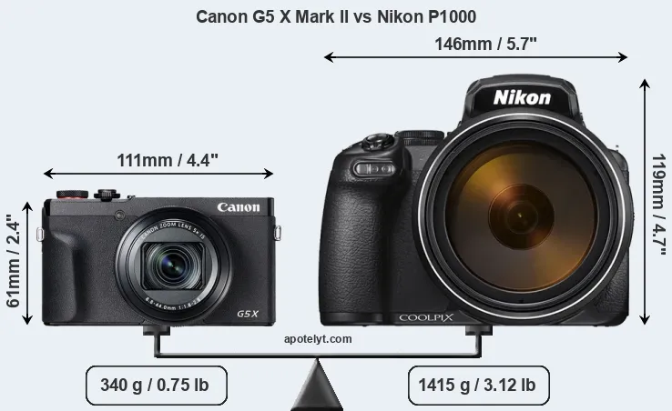 If the front view area (width x height) of the cameras is taken as an aggregate measure of their size, the Nikon P1000 is considerably larger (157 percent) than the Canon G5 X Mark II. Moreover, the P1000 is substantially heavier (316 percent) than the G5X Mark II. In this context, it is worth noting that neither the G5X Mark II nor the P1000 are weather-sealed.