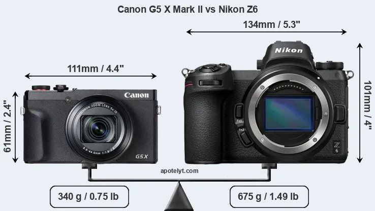 An illustration of the physical size and weight of the Canon G5 X Mark II and the Nikon Z6 is provided in the side-by-side display below. The two cameras are presented according to their relative size. Three successive views from the front, the top, and the rear are shown. All width, height and depth measures are rounded to the nearest millimeter.