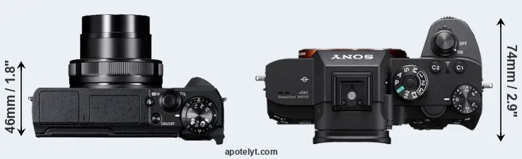 The side-by-side display below illustrates the physical size and weight of the Canon G5 X Mark II and the Sony A7R III. The two cameras are presented according to their relative size. Three successive views from the front, the top, and the rear are shown. All width, height and depth measures are rounded to the nearest millimeter.