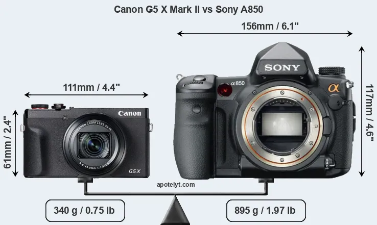 The physical size and weight of the Canon G5 X Mark II and the Sony A850 are illustrated in the side-by-side display below. The two cameras are presented according to their relative size. Three consecutive perspectives from the front, the top, and the back are available. All width, height and depth dimensions are rounded to the nearest millimeter.