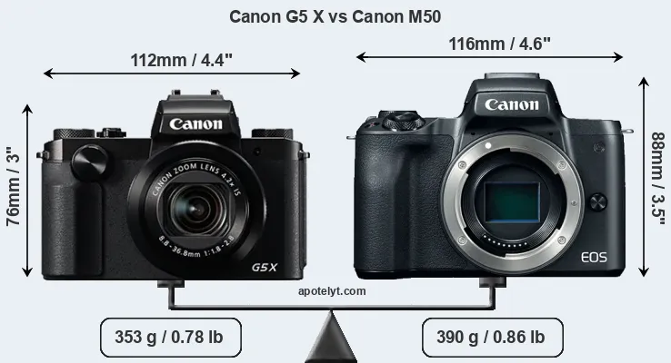 The physical size and weight of the Canon G5 X and the Canon M50 are illustrated in the side-by-side display below. The two cameras are presented according to their relative size. Three consecutive perspectives from the front, the top, and the back are available. All size dimensions are rounded to the nearest millimeter.