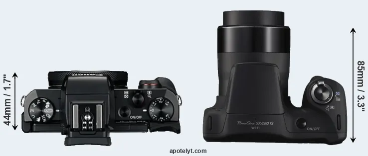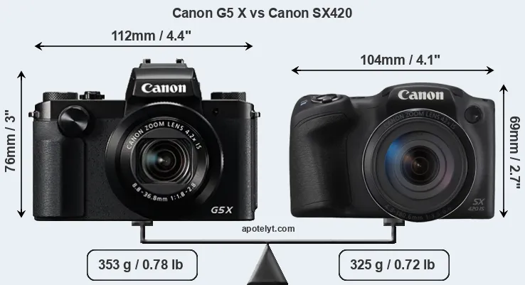 The side-by-side display below illustrates the physical size and weight of the Canon G5 X and the Canon SX420. The two cameras are presented according to their relative size. Three successive views from the front, the top, and the rear are shown. All width, height and depth dimensions are rounded to the nearest millimeter.