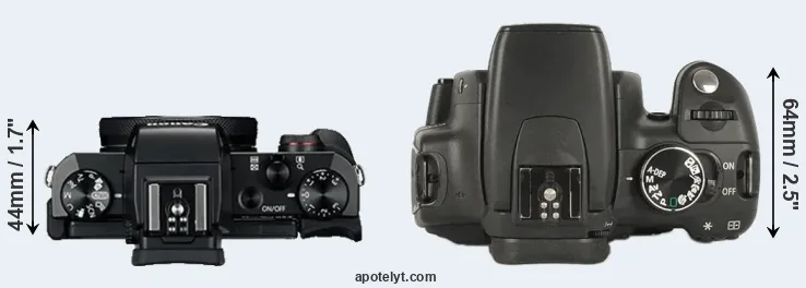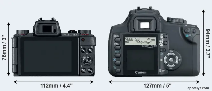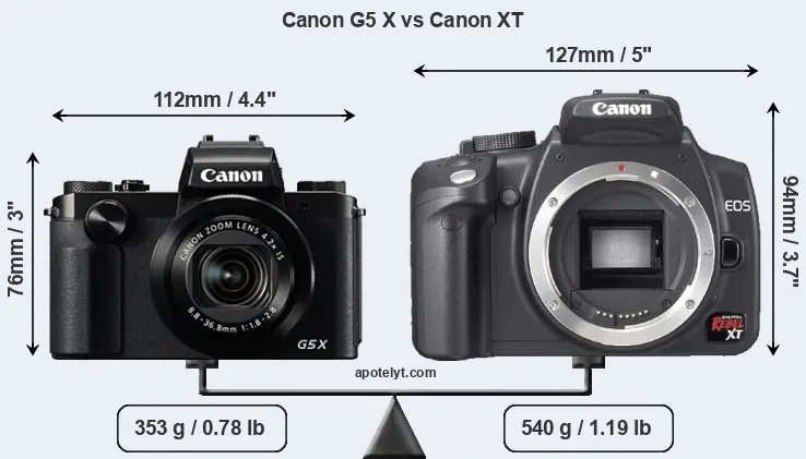 The side-by-side display below illustrates the physical size and weight of the Canon G5 X and the Canon XT. The two cameras are presented according to their relative size. Three consecutive perspectives from the front, the top, and the back are available. All width, height and depth measures are rounded to the nearest millimeter.
