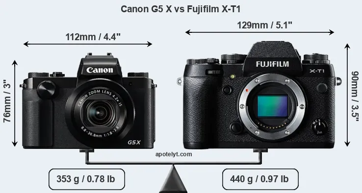 An illustration of the physical size and weight of the Canon G5 X and the Fujifilm X-T1 is provided in the side-by-side display below. The two cameras are presented according to their relative size. Three successive views from the front, the top, and the rear are shown. All width, height and depth dimensions are rounded to the nearest millimeter.