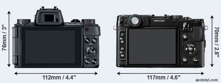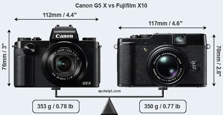 The physical size and weight of the Canon G5 X and the Fujifilm X10 are illustrated in the side-by-side display below. The two cameras are presented according to their relative size. Three consecutive perspectives from the front, the top, and the back are available. All size dimensions are rounded to the nearest millimeter.