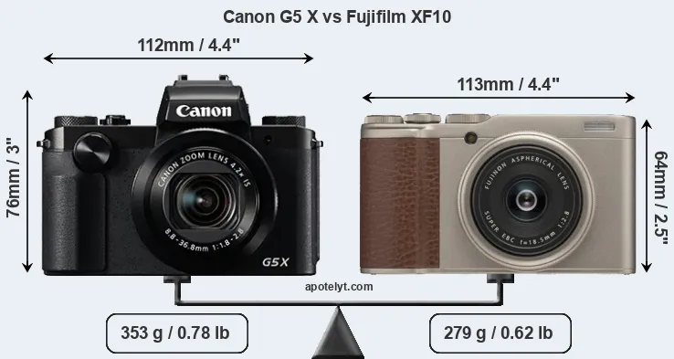 The physical size and weight of the Canon G5 X and the Fujifilm XF10 are illustrated in the side-by-side display below. The two cameras are presented according to their relative size. Three consecutive perspectives from the front, the top, and the back are available. All width, height and depth measures are rounded to the nearest millimeter.