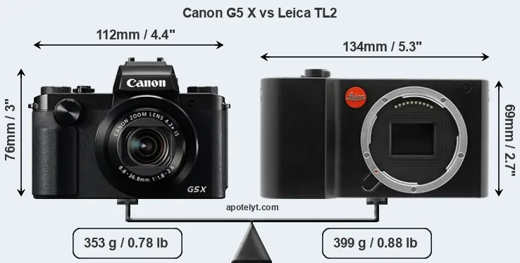 An illustration of the physical size and weight of the Canon G5 X and the Leica TL2 is provided in the side-by-side display below. The two cameras are presented according to their relative size. Three consecutive views from the front, the top, and the rear side are shown. All width, height and depth measures are rounded to the nearest millimeter.