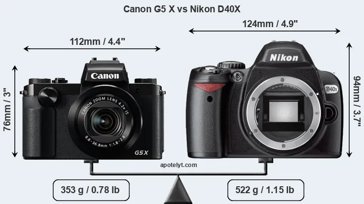 An illustration of the physical size and weight of the Canon G5 X and the Nikon D40X is provided in the side-by-side display below. The two cameras are presented according to their relative size. Three successive views from the front, the top, and the rear are shown. All width, height and depth dimensions are rounded to the nearest millimeter.