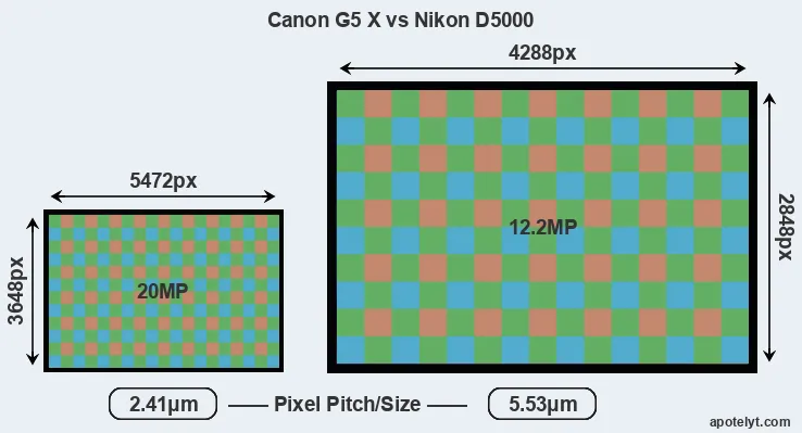 Despite having a smaller sensor, the Canon G5 X offers a higher resolution of 20 megapixels, compared with 12.2 MP of the Nikon D5000. This megapixels advantage comes at the cost of a higher pixel density and a smaller size of the individual pixel (with a pixel pitch of 2.41μm versus 5.53μm for the D5000). However, it should be noted that the G5X is much more recent (by 6 years and 6 months) than the D5000, and its sensor will have benefitted from technological advances during this time that make it possible to gather light more efficiently.