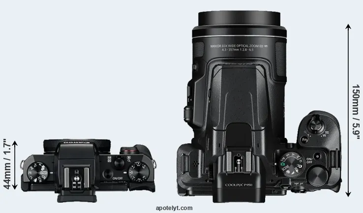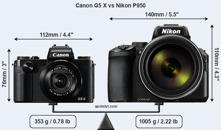 An illustration of the physical size and weight of the Canon G5 X and the Nikon P950 is provided in the side-by-side display below. The two cameras are presented according to their relative size. Three successive views from the front, the top, and the rear are shown. All width, height and depth dimensions are rounded to the nearest millimeter.