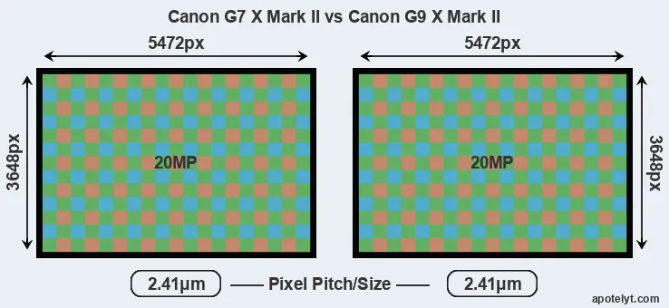 The two cameras under review do not only share the same sensor size, but also offer an identical resolution of 20 megapixels. This similarity in sensor specs implies that both the G7X Mark II and the G9X Mark II have the same pixel density, as well as the same pixel size. It should, however, be noted that the G9X Mark II is a somewhat more recent model (by 10 months) than the G7X Mark II, and its sensor might have benefitted from technological advances during this time.